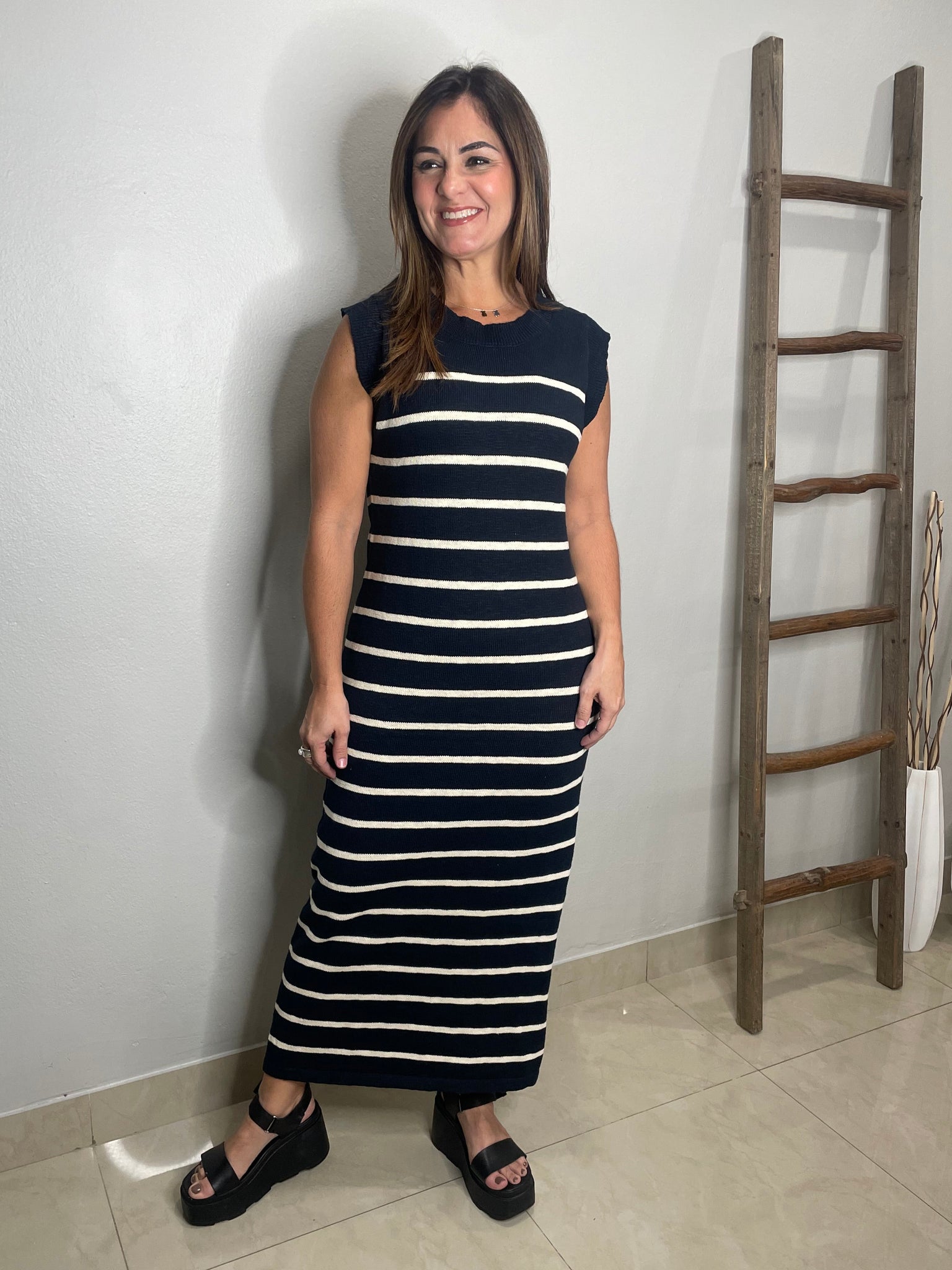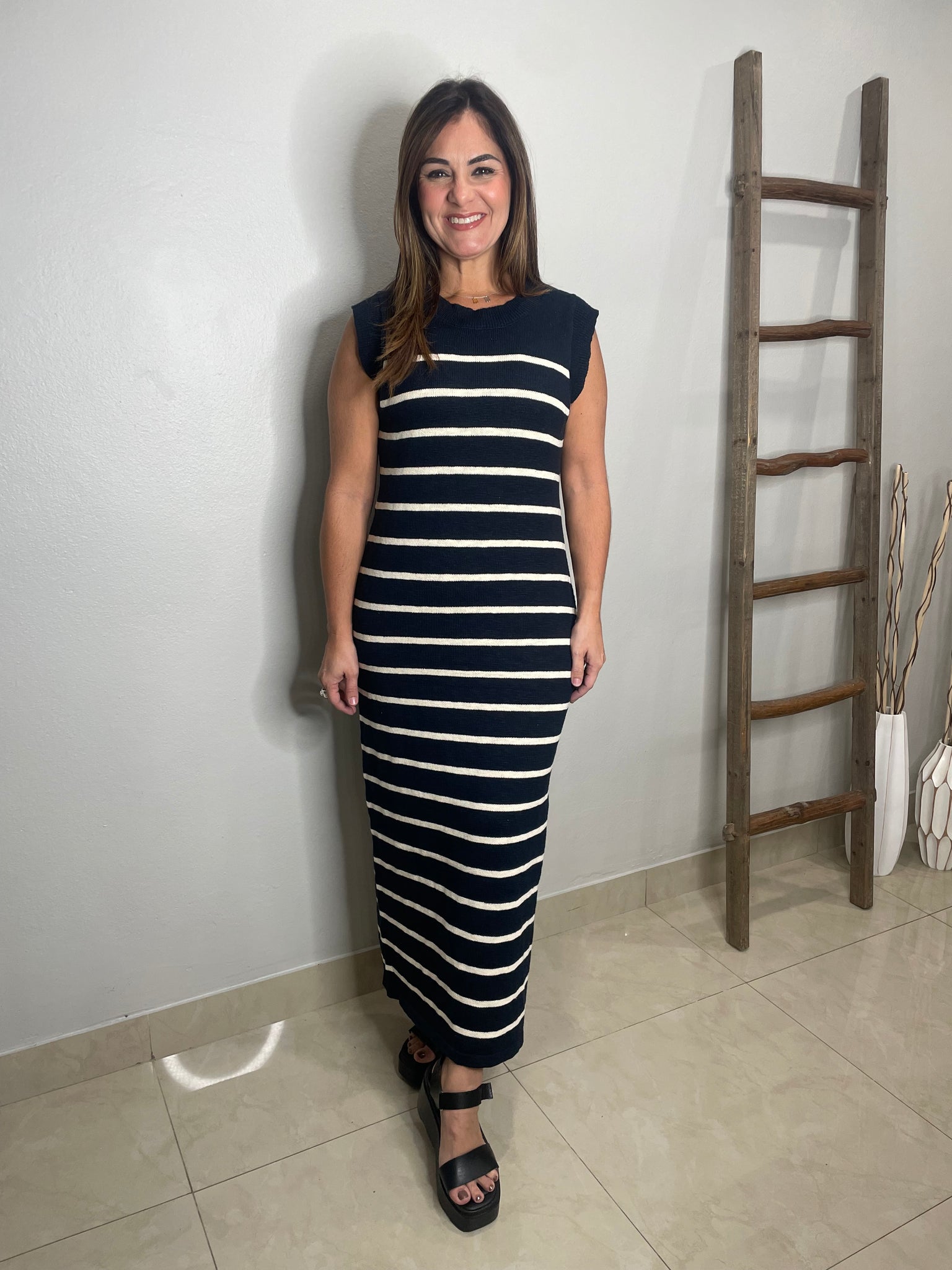 Sleeveless sweater knit strip midi dress with one side slit.