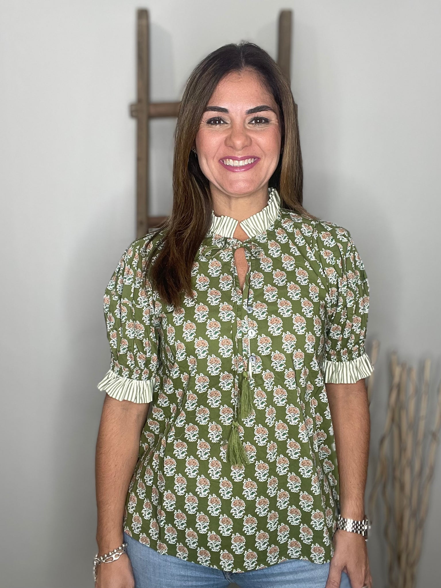 Botanical print puff sleeve top featuring striped ruffle neck band collar and tassel tie at front. Woven. Unlined. Non-sheer. Lightweight.