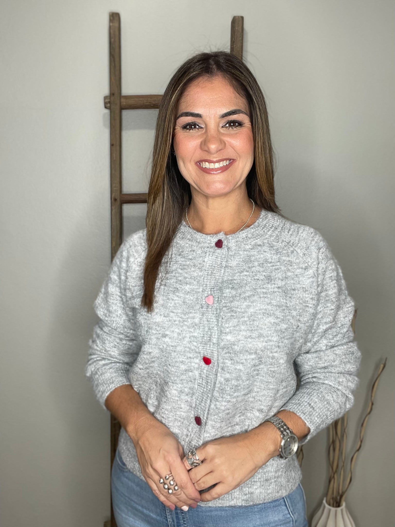 Multi color heart button sweater cardigan in stretch knit fabric. This soft knitted cardigan features multi colored heart shape button closure, long sleeve with ribbed cuff, a round neck, and ribbed hem.