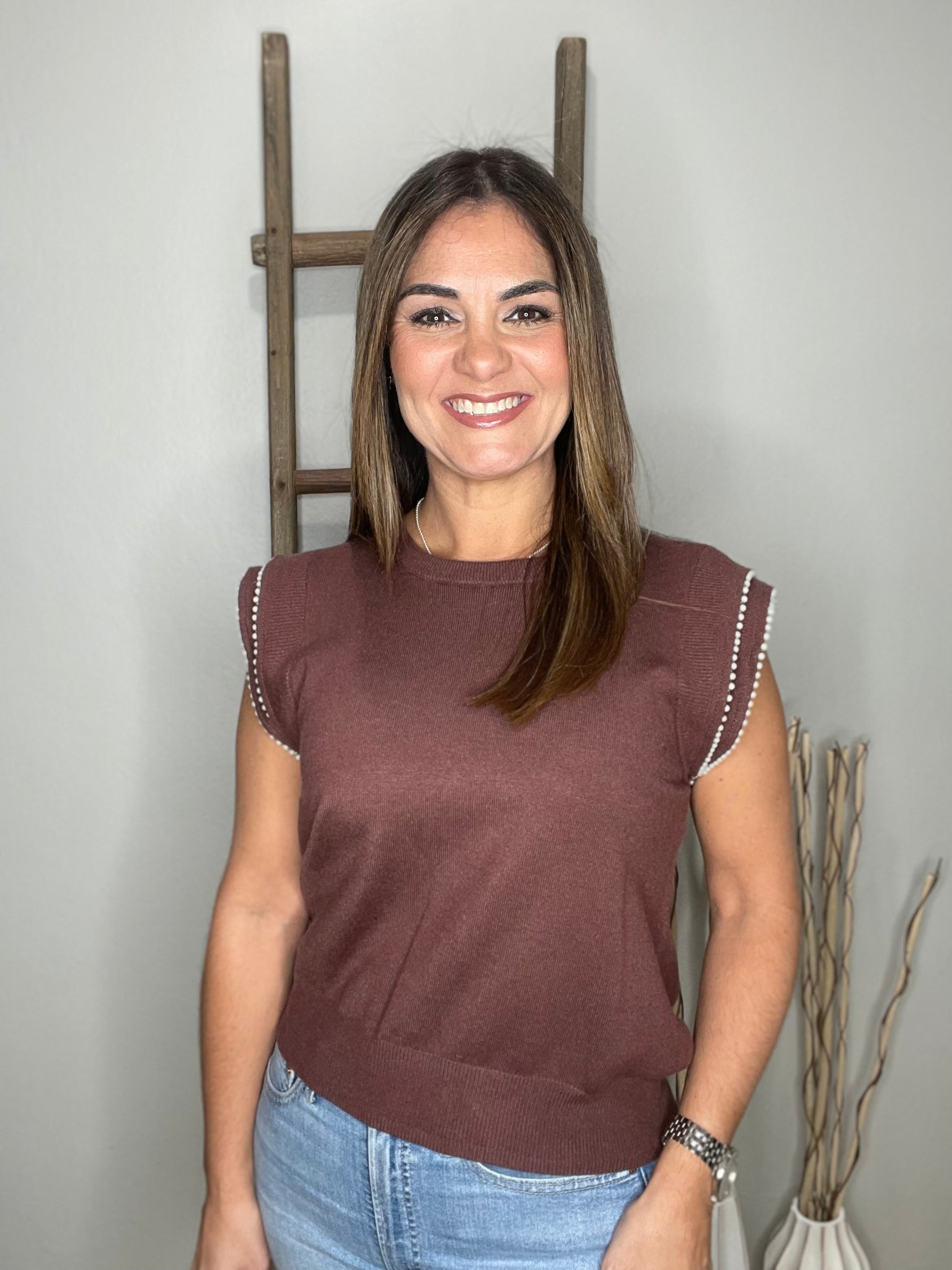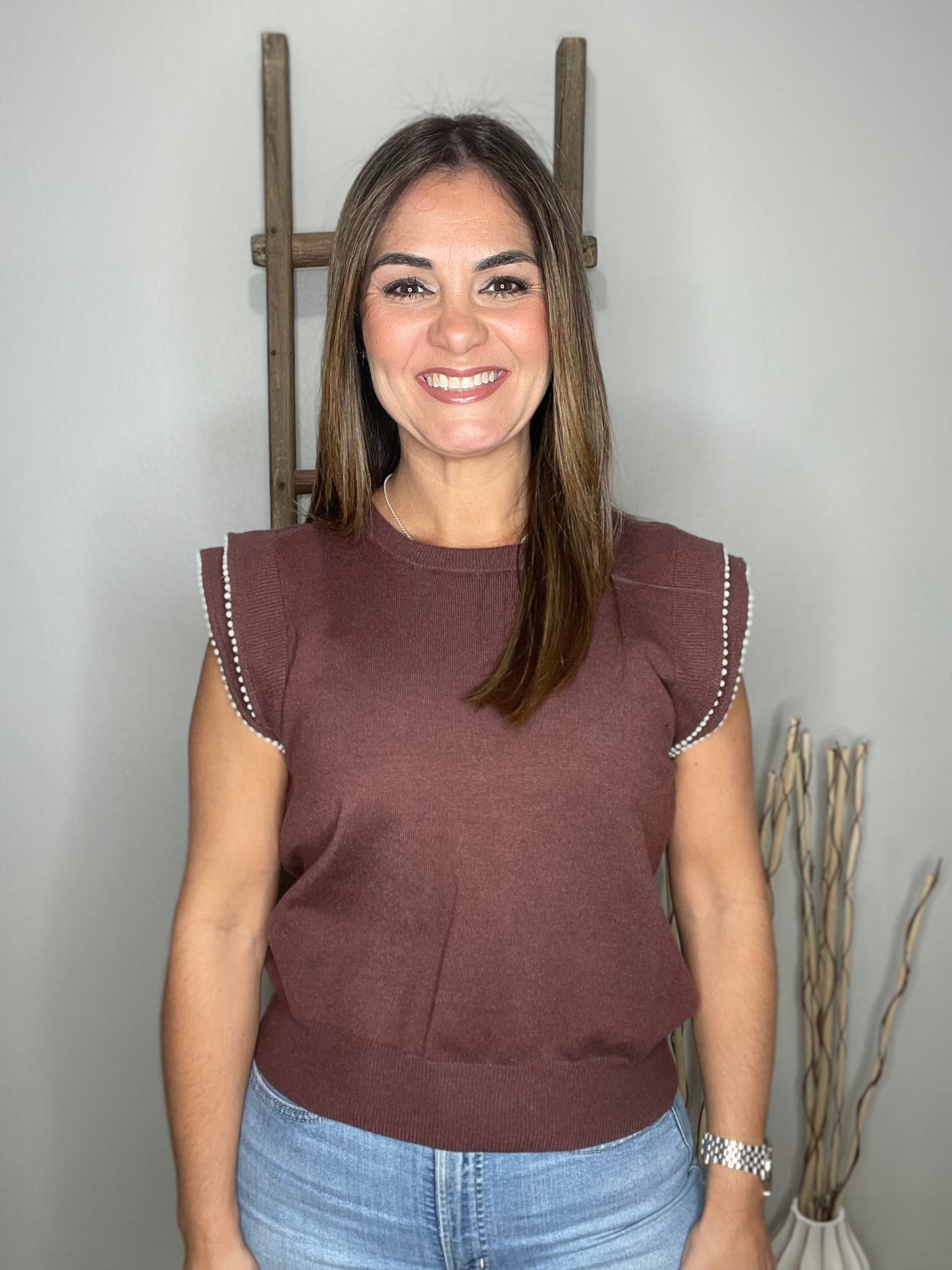 Pearl trim sleeveless sweater top in knitted fabric. This pullover style features double layer cap sleeves with pearl detail, ribbed hem, and ribbed round neck.