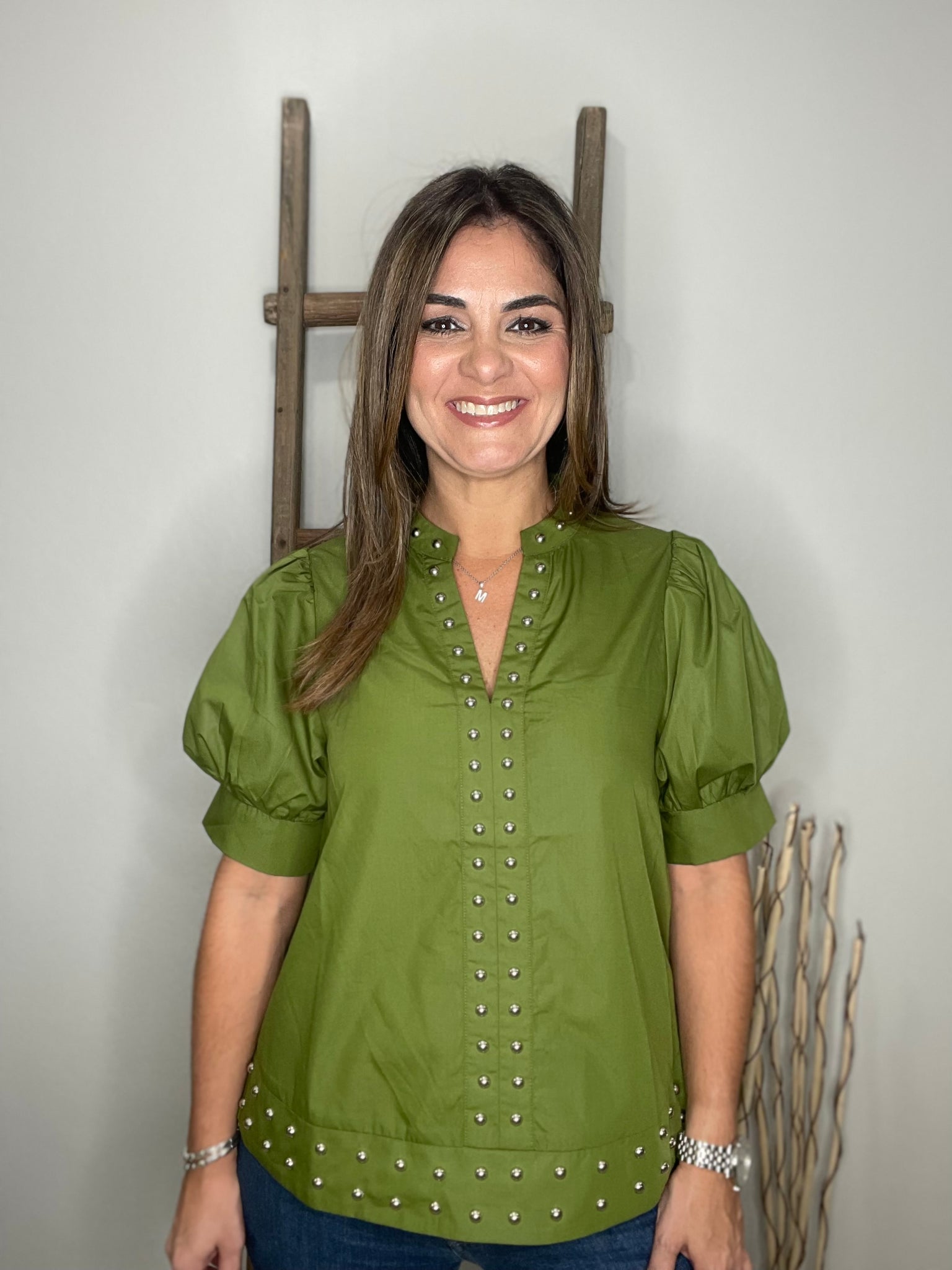 Solid cuff band short puff sleeve pullover top featuring stud accent detail. Unlined. Woven. Non-sheer. Lightweight.