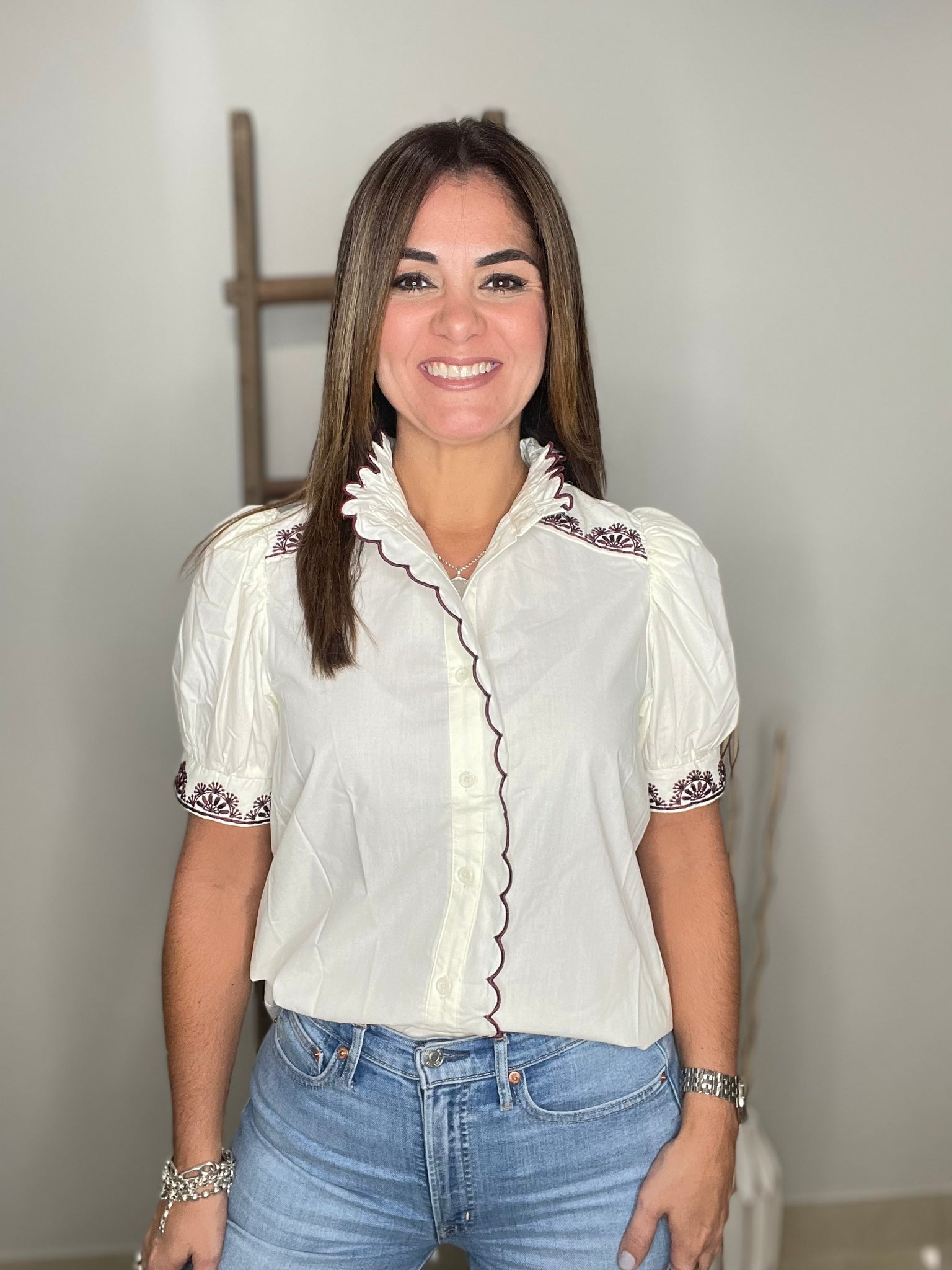 Solid embroidered short puff sleeve top featuring scallop accent trim and high ruffled neck. Embroidered back yoke detail. Button closure at front. Unlined. Woven. Non-sheer. Lightweight.
