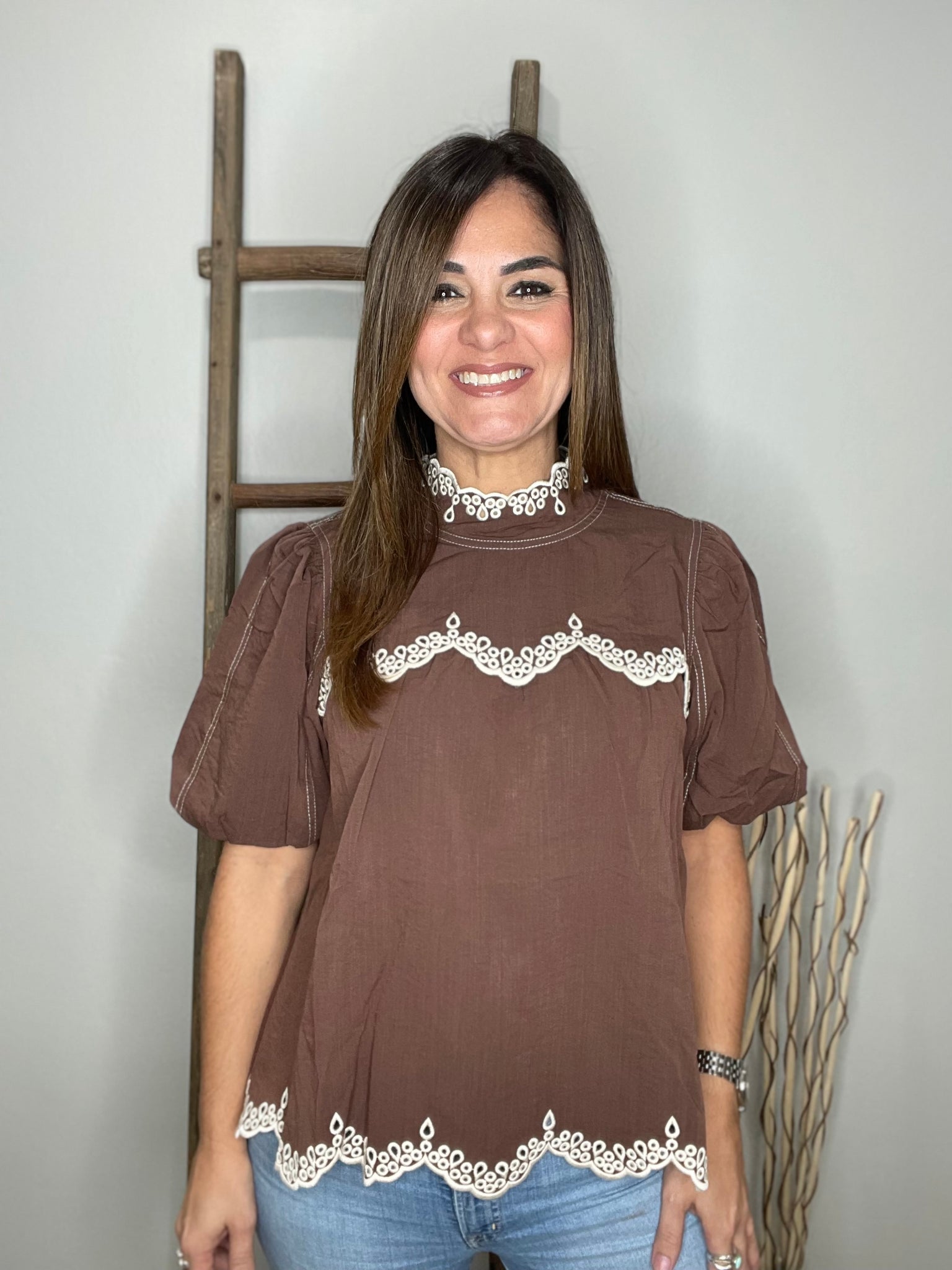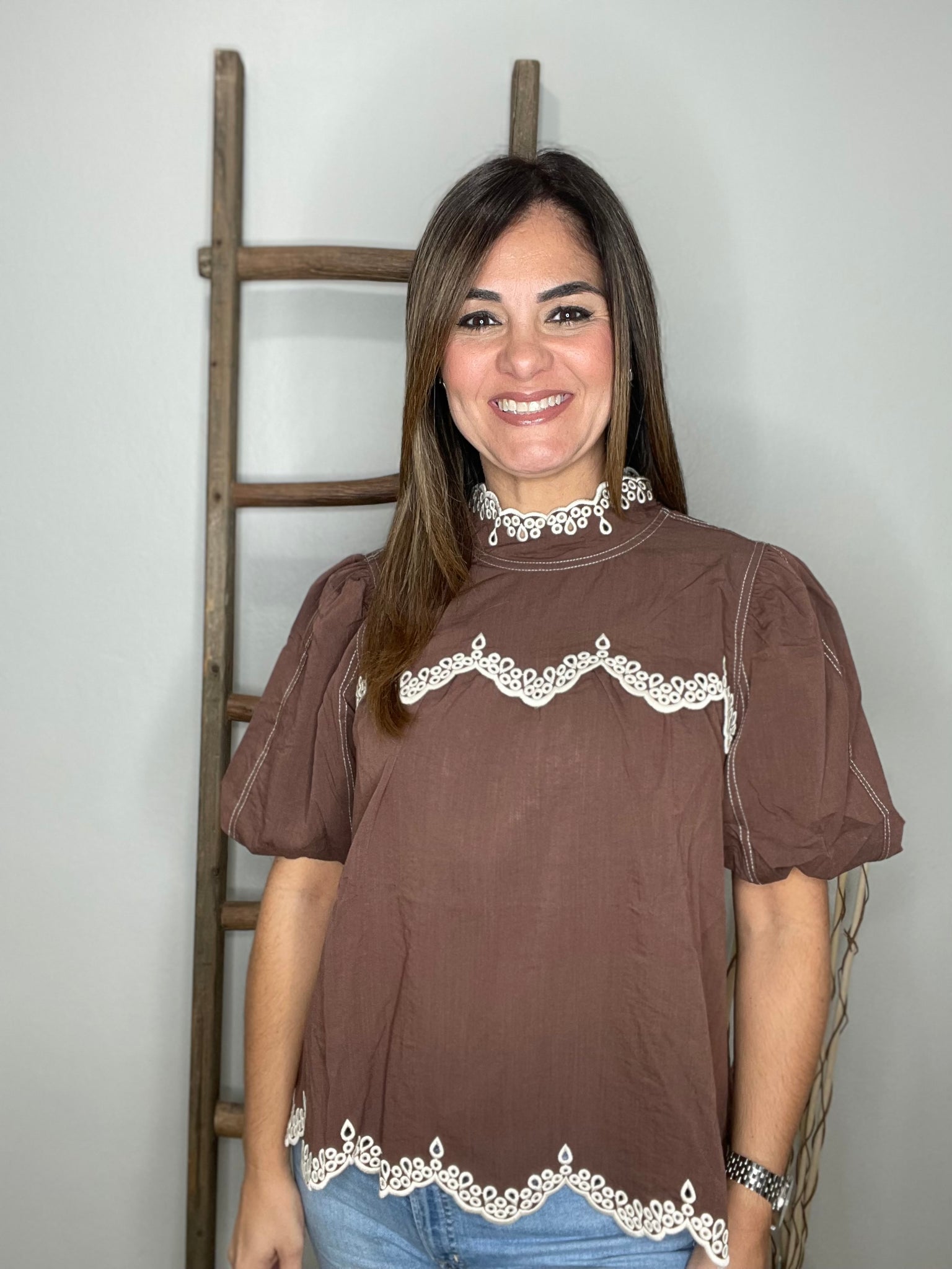 Solid puff sleeve top featuring contrast scallop embroidered trim at neck, chest, hem. Button closure at back. Unlined. Woven. Non-sheer. Lightweight.