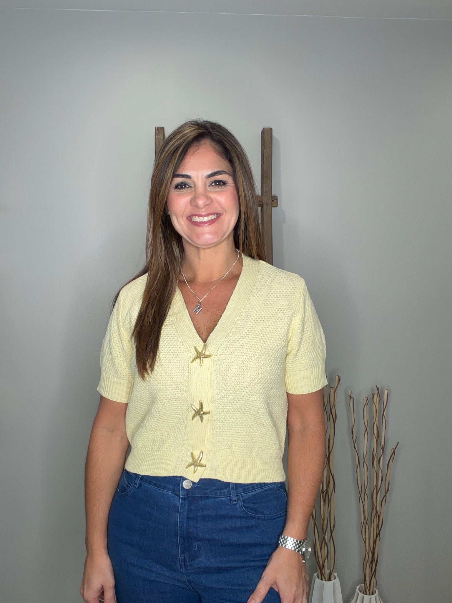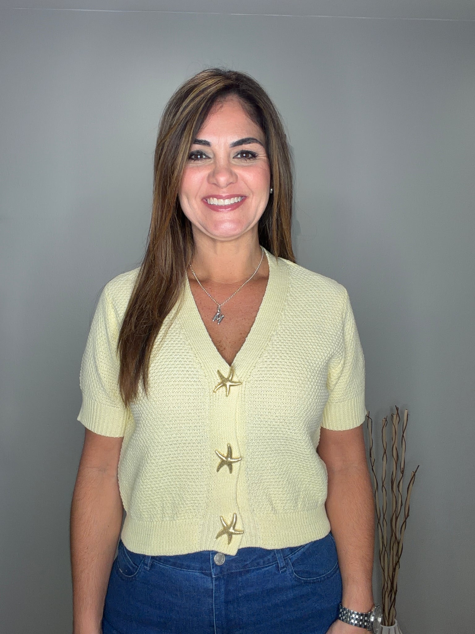 Solid short sleeve sweater knit top featuring starfish button closure at front. V-neck. Ribbed sleeve cuffs and hem. Unlined. Knit. Non-sheer. Lightweight.