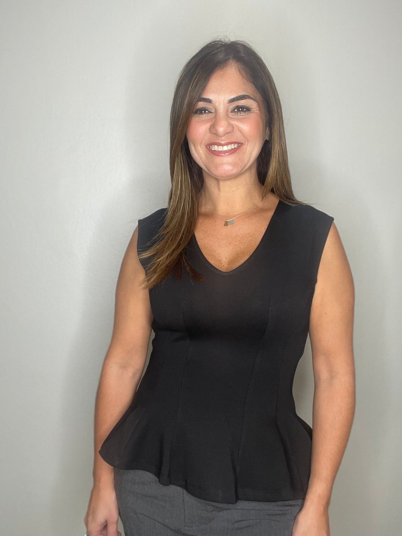 Solid sleeveless peplum top with V-neckline flared peplum hem. Back invisible zipper.